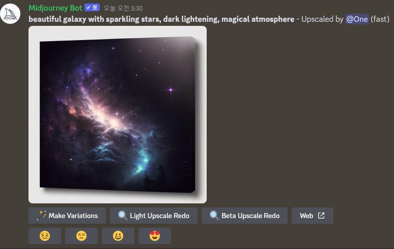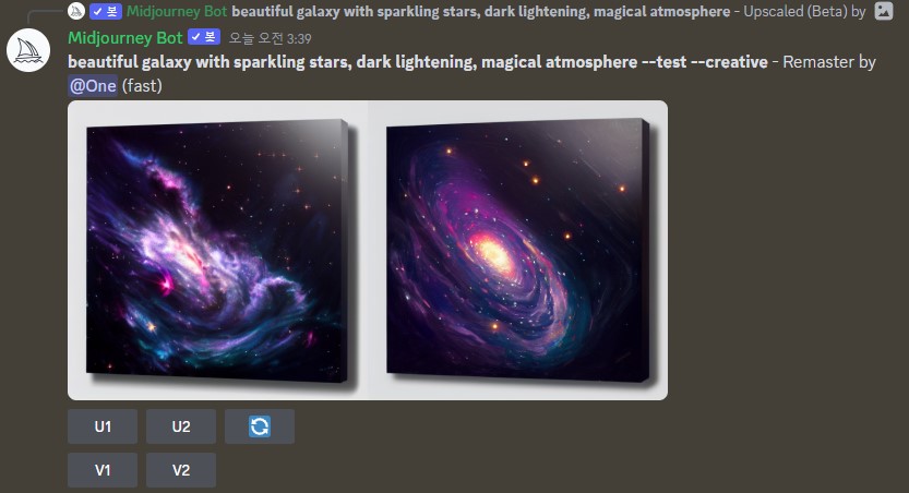디스코드 그림 하단에 Remaster 버튼이 새로 생겼습니다. 이버튼을 누르면 또 다른 2개의 이미지가 생성됩니다.