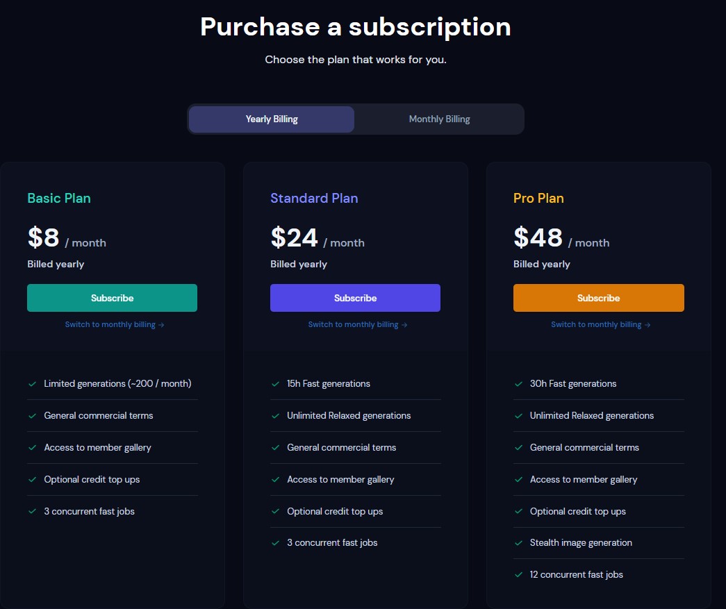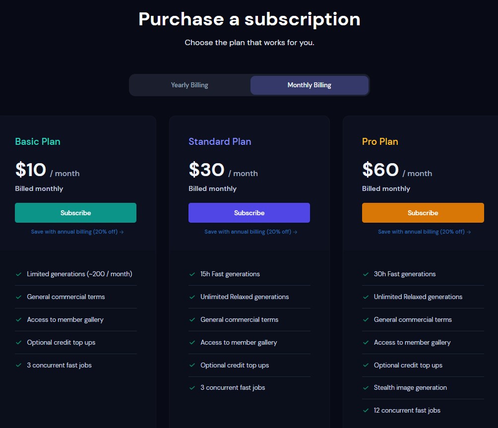 Basic Plan(기본 플랜)은 1달에 200개씩 이미지를 만들 수 있으며, 만약 그 횟수를 넘으면 시간당 돈을 더 내게 됩니다.