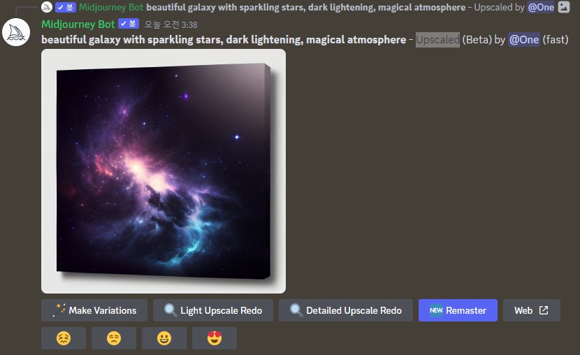 디스코드 그림 하단에 Remaster 버튼이 새로 생겼습니다. 이버튼을 누르면 또 다른 2개의 이미지가 생성됩니다.